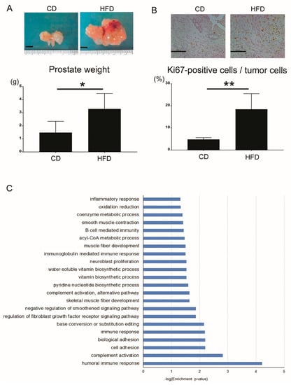 (A) Representative gross findings of the prostatic tissues (the black bar indicates 5 mm) (top) and prostate weights (n = 6 and 4, respectively) (bottom) of the model mice at 22 weeks of age. (B) Representative images of Ki67 staining for the prostatic tissues (top) and the ratio of Ki67-positive cells to tumor cells (n = 4 and 3, respectively) (bottom) of the model mice at 22 weeks of age. (C) Gene ontology analysis using mRNA microarray technology of the prostatic tissues of the model mice at 22 weeks of age (HFD-fed vs. CD-fed, n = 3, respectively; fold change >2.0, p < 0.05, biological process). CD, control diet; HFD, high-fat diet. * p < 0.05, ** p < 0.01.