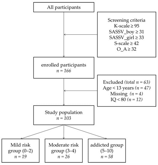 We screened children and adolescents (aged 7–18 years) who used excessively internet games and/or smartphones in Clinic I-CURE Centers. All participants were screened using questionnaires pertaining to Internet and smartphone addiction (e.g., the Korean Scale for Internet Addiction for adolescents (K-scale); the Korean Smartphone Addiction Scale (S-scale); and the Internet Addiction Proneness Scale for Adolescents (O_A), which is completed by caregivers). Subjects who scored above the cutoff for addiction on at least one screening questionnaire were enrolled in the study. We enrolled 166 participants between August 2015 and December 2017. Of these, 47 children were excluded because the sample size of children was small and there were differences between the questionnaires in children and adolescents (e.g., BDI versus CDI, etc.), and 16 adolescents with intelligence quotient scores <80 or missing data were excluded from the study. The final analysis included 103 subjects between the ages of 13 and 18 years. In this study, the interviewers consisted of a master’s-level of clinical psychology and every interviewer was trained by addiction and/or child-adolescents psychiatry specialists. A flow chart of the study is shown in Figure 1.