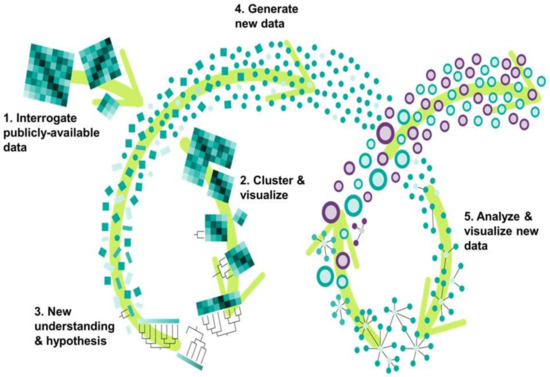 An integrated framework of iterative, systems-level analysis and experimental validation provides new insights. Large amounts of raw data, generated by new experimentation or re-analyzed from public databases (1), are analyzed by clustering approaches to easily visualize data topology (2). This visualization fosters a new, deeper understanding that informs a new hypothesis (3). Experimental validation of the new hypothesis generates new data (4), which is analyzed and visualized as a system (5).