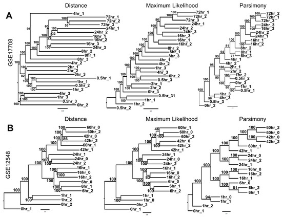 Similarly, we performed phylogenetic clustering on additional datasets where samples had been analyzed longitudinally, including GSE17708 [38], microarray data from A549 lung adenocarcinoma cells treated with TGF-β over a period of 72 h, and GSE12548, microarray data from human ARPE-19 retinal pigment epithelium cells treated with TGF-β and TNF-α over 60 h [39]. For both of these datasets, phylogenetic clustering reconstructed the temporal order of treatments with strong bootstrap support (Figure 3A,B).