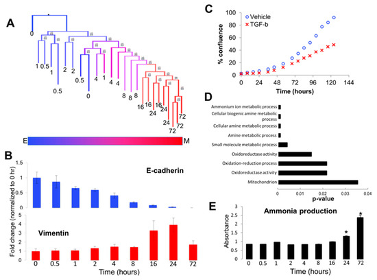 Visualization of tree topology reveals altered metabolism during epithelial–mesenchymal transition (EMT). (A) The topology of the maximum-likelihood reconstruction of GSE17708 showed an admixed clade at early time points in A549 cells with TGF-β treatment, with a clearly-resolved clade of later time points after eight hours as the phenotypic signal switched from epithelial to mesenchymal. (B) Consistent with the tree topology, changes in EMT biomarkers E-cadherin and vimentin were not apparent until after eight hours of treatment. * indicate p < 0.05 as compared to the 0 h time point (C) Growth curves of A549 cells treated with vehicle (blue circles) or TGF-β (red ×) analyzed by IncuCyte time-lapse imaging revealed TGF-β-induced growth inhibition at 48–72 h. (D) Pathway analysis of genes contributing to the bifurcation of early (<8 h) and late (≥8 h) time point clades revealed TGF-β-induced changes in amine metabolism pathways at the later time points as compared to the early time points. (E) Ammonia production assays validated the prediction that TGF-β induces upregulation of ammonia production.