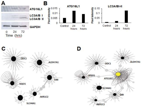 Previous research has identified a connection between upregulation of ammonia production and induction of autophagy [42]. Based on this connection, we tested if TGF-β-induced EMT led to an increase in autophagy markers. In support of this hypothesis, TGF-β treatment led to upregulation of autophagy markers LC3A/B and ATG16L1 (Figure 5A,B). To better understand the connections between ammonia production and autophagy, we used Cytoscape to construct gene regulatory networks related to amine metabolism genes and autophagy regulators. We constructed gene networks that included the ammonia production genes identified by the pathway analysis, along with the autophagy markers LC3A/B and ATG16L1, that we identified in our western blots to be activated upon TGF-β treatment. Although we found few gene–gene interactions among amine metabolism genes alone (Figure 5C), when we added the autophagy regulator ATG16L1 to this network, it connected the entire set of previously-isolated amine metabolism subnetworks (Figure 5D). Our results suggest that TGF-β-mediated EMT is associated with increased amine production and upregulation of autophagy. It remains to be tested in this system if the ammonia production induces autophagy, as has been demonstrated previously in both yeast and mouse embryonic fibroblasts [42], or if TGF-β-induced autophagy upregulation leads to more ammonia. However, our results demonstrate a connection between TGF-β-mediated EMT, altered amine production, and upregulation of autophagy.