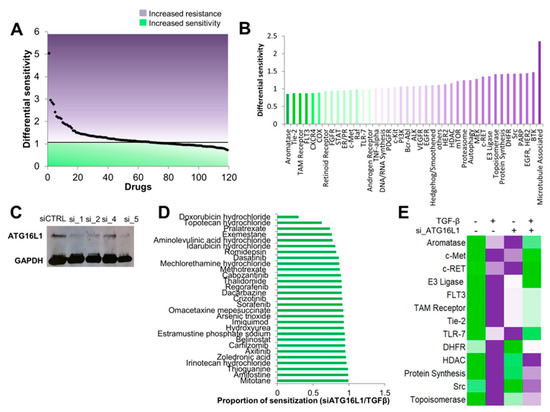 Next, to investigate the importance of autophagy in promoting TGF-β-induced therapy resistance, we performed siRNA-mediated knockdown of ATG16L1, the autophagy marker we identified as upregulated in TGF-β-treated cells. We first tested knockdown efficiency using four independent siRNAs and selected by Western blot analysis siRNA_1 for subsequent drug screens (Figure 6C). We then screened A549 with the same 119 drugs +/– TGF-β and treated with either a non-silencing siRNA or siRNA_1 targeting ATG16L1. Remarkably, ATG16L1 knockdown re-sensitized cells to 29/71 (41%) of drugs for which TGF-β treatment led to increased resistance (Figure 6D). Interestingly, these drugs included current standard-of-care therapies for small-cell lung cancer (SCLC), doxorubicin, and topotecan, as well as anti-VEGFR therapies, regorafenib, and axitinib, both of which have shown promising clinical benefits in early stage clinical trials against advanced non-small-cell lung cancer (NSCLC) [49,50], and cabozantinib, a tyrosine kinase inhibitor that has shown efficacy along with, or in combination with, erlotinib in the treatment of EGFR wild-type NSCLC patients [51]. Analysis by pathways showed that, on average, autophagy inhibition re-sensitized cells to multiple targeted therapies, including c-MET, c-RET, FLT3, TAM2, and dihydrofolate reductase (DHFR) (Figure 6E). Together, our results support the hypothesis that TGF-β-mediated therapy resistance is driven, in part, by the autophagy regulator ATG16L1, suggesting the potential use of autophagy inhibitors as a concurrent or adjuvant therapy to counter resistance.