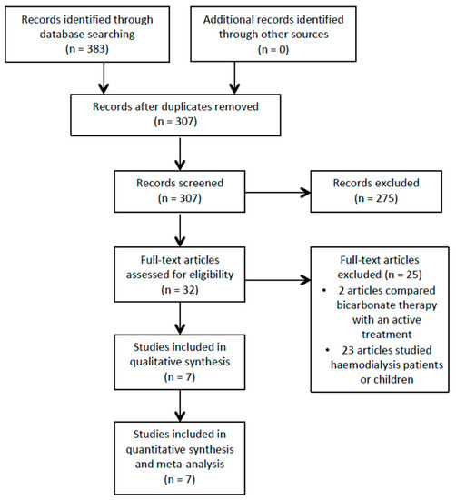 - National Institute for Health Research. Does Sodium Bicarbonate Improve Health Outcomes in Patients with Chronic Kidney Disease and Metabolic Acidosis? Systematic Review and Meta-Analysis of Randomised Controlled Trials. PROSPERO International Prospective Register of Systematic Reviews. Available online: http://www.crd.york.ac.uk/PROSPERO/display_record.php? ID=CRD42018112908 (accessed on 7 February 2019).
