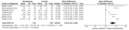 All seven RCTs studied serum bicarbonate levels following the randomisation of study participants (see Figure 4) [17,18,19,20,21,22,23]. Data from 707 patients were analysed; 57.9% were males and their mean age ranged from 37.5 ± 17 years to 65.5 ± 11.4 years. Serum bicarbonate levels were higher after oral bicarbonate therapy (mean difference 3.4 mmol/L; 95% CI 1.9–4.9) but the results were highly heterogeneous (I2 = 97%).