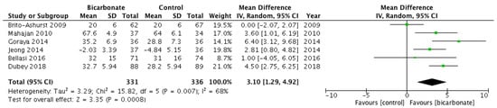 Six RCTs [18,19,20,21,22,23] investigated eGFR after randomising patients to oral bicarbonate therapy or placebo (see Figure 5). Data were not presented in a format that allowed the rate of change of eGFR (the primary outcome measure) to be analysed, so eGFR at the end of follow-up was used. A total of 667 patients were analysed; 57.7% were males and their mean age ranged from 50.1 ± 11.6 years to 65.5 ± 11.4 years. eGFR favoured bicarbonate therapy (mean difference 3.1 mL/min per 1.73 m2; 95% CI 1.3–4.9) but the analysis revealed moderately high heterogeneity (I2 = 68%).