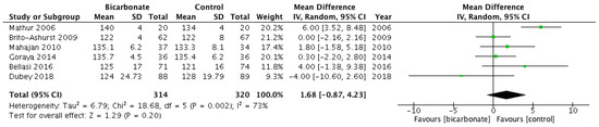 Six studies recorded systolic blood pressure (BP) as an outcome measure (see Figure 6) [17,18,19,21,22,23]. A total of 635 patients were included; 57.3% were males and their mean age ranged from 37.5 ± 17 years to 65.5 ± 11.4 years. Oral bicarbonate therapy had uncertain effects on systolic BP when compared to placebo or conventional treatment for CKD (p = 0.19).