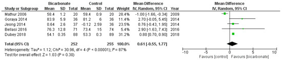 The following are available online at http://www.mdpi.com/2077-0383/8/2/208/s1, Supplementary Figure S1. Forest plot comparing the effects of oral bicarbonate therapy and control on serum creatinine levels. Supplementary Figure S2. Forest plot comparing the effects of oral bicarbonate therapy and control on eGFR at one year. Supplementary Figure S3. Forest plot comparing the effects of oral bicarbonate therapy and control on serum bicarbonate levels at one year.
