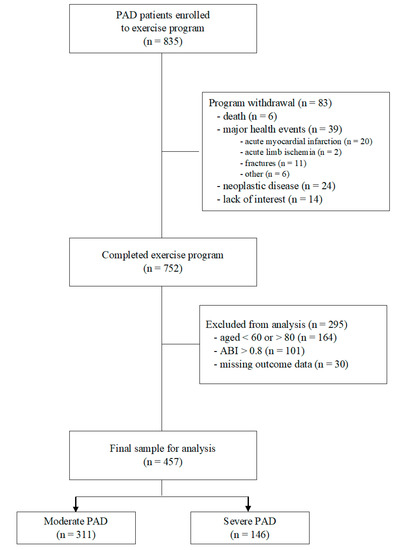 From January 2005 to January 2013, 835 patients with PAD were enrolled in the rehabilitation program. A flow diagram of the participants and the reasons for exclusion are reported in Figure 1.