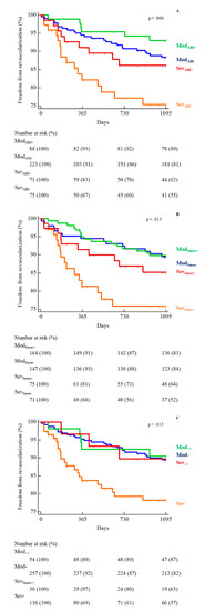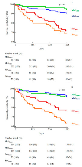 There were 69 deaths (15%) during the follow-up period; 43 in the Sev and 26 in the Mod group (29% vs. 8%, respectively, log-rank p < 0.001).