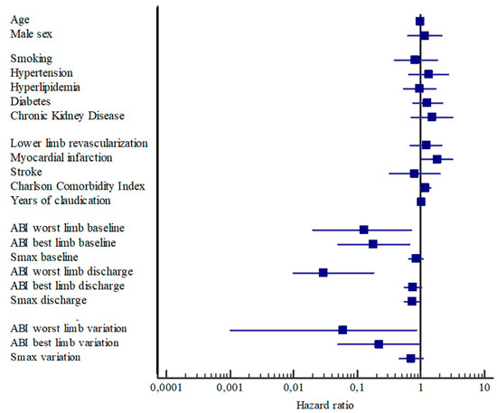 Several independent predictors were identified in the Sev group, but the ABI improvement in the more impaired limb was the most protective factor against peripheral revascularization (HR: 0.003; 0.0001–0.09), which reduced the risk by greater than 300%.