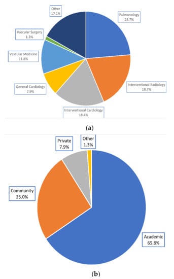 Of 76 respondents to the PERT Consortium questionnaire, the majority were pulmonologists, interventional radiologists, and interventional cardiologists, and practiced in an academic hospital (Figure 1). Seventy-two (94.7%) practiced in the United States, 2 (2.6%) in Canada, 1 (1.3%) in Argentina, and 1 (1.3%) in Brazil.