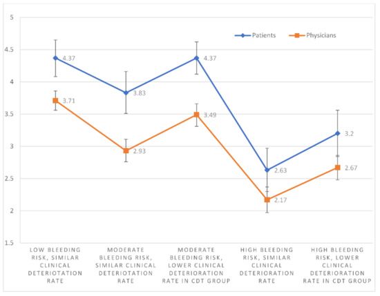 Similarly, bleeding risk, clinical deterioration risk, and responder type were independent predictors of CDT preference (p < 0.001) when controlling for the other two factors. The effect of increased bleeding risk on CDT scores was unchanged at different levels of clinical deterioration risk and vice versa (p = 0.695). The effect of increased bleeding (p = 0.853) or clinical deterioration risk (p = 0.668) on CDT scores was also not affected by responder type.