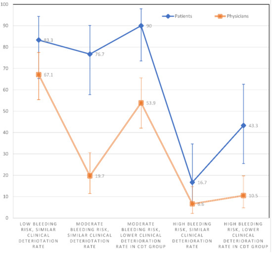 Clinical deterioration also influenced patients and physicians differently. In scenarios with intermediate bleeding risk, more than 75% of patients preferred CDT, regardless of whether it decreased the rate of clinical deterioration. In contrast, the rate of clinical deterioration did affect physicians’ CDT preference in these scenarios: A majority of physicians preferred CDT only when the increased bleeding risk was offset by a decrease in clinical deterioration. These differences may also be the result of experience. Most physicians have witnessed and managed clinically deteriorating patients, whereas most patients do not have a personal understanding of such incidents.