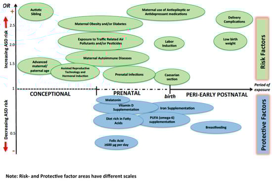As already outlined, our knowledge about possible genetic and environmental risk factors for ASD is improving. However, the individual developmental trajectories and outcomes are not just the result of the influence of risk factors, as the interaction between risk and protective factors has to be considered as well. In the past, protective factors were thought to be just those characteristics inherent to the individual, such as a high intellectual quotient or better social skills. Now, there is an increasing understanding that there is the need to look also at possible pre- and postnatal environmental factors. However, despite the growing interest in the identification of environmental risk factors and their potential prevention in order to decrease ASD risk, to date, little is known about protective factors for ASD. Nevertheless, in the last few years, increasing efforts have been made to try to identify factors that may improve long-term outcomes [].