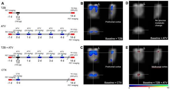 PET evidence of ATV effect during TZB therapy. (A) The experimental design. (B) A decrease in cerebral glucose metabolism was observed in the region of the bilateral frontal lobe following administration of TZB or (C) CTX relative to baseline (p < 0.005). (D) No significant difference was found between ATV treatment and baseline (p < 0.005). (E) An increase in cerebral glucose metabolism was observed in the region of the medial prefrontal cortex following administration of ATV (p < 0.005). Decreased glucose metabolism after TZB treatment was rescued after administration of ATV. PET, positron emission imaging. FDG PET, 18F-fluorodeoxyglucose positron emission tomography. ATV, atorvastatin. TZB, trastuzumab. CTX, cyclophosphamide. (n = 10 per group).
