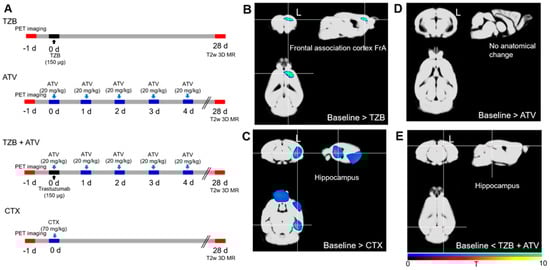 A cognitive deficit was evaluated after administration of 150 μg of TZB (n = 7 per group, female). A total of 20 mg/kg of ATV was administered for 5 days to determine any effects on recovery of the cognitive deficit. Similarly, 70 mg/kg (equivalent to a dose of 215 mg/m2 in humans, which is within the range of doses typically used for treatment of women with metastatic breast cancer (100–250 mg/m2)) of cyclophosphamide (CTX) was administered. The experimental design, including the drug doses, dose schedule, and PET imaging schedule used, is described in Figure 1A, and the MR imaging schedule is described in Figure 2A.