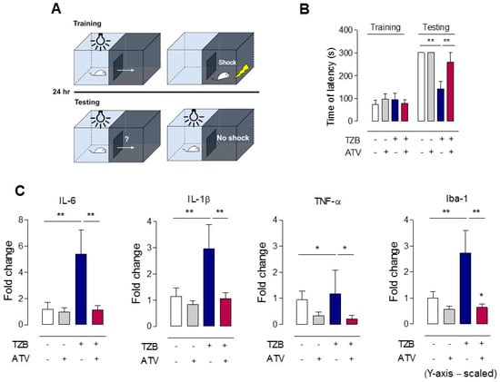 Behavioral study and pertaining the level of cytokines. (A) Schematic of passive avoidance test. Passive avoidance tests were performed to evaluate memory impairment in all groups. (B) The mean time of latency. The ATV co-administration group significantly extended the mean time of step-through latency (time of latency was 259 s) compared with that of the single TZB administration group. Values are means ± standard deviation of the mean (n = 6). (** p < 0.005). (C) Quantitative real-time reverse transcription polymerase chain reaction. (* p < 0.05 and ** p < 0.005). ATV, atorvastatin. TZB, trastuzumab.