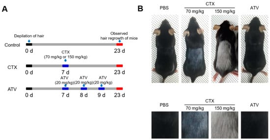 To investigate whether ATV induced abnormal hair regrowth in mice, hair was shaved from the dorsal surface of the back in C57BL/6 mice (n = 7 per group) by shaving and waxing using wax strips (Veet, Slough, UK), and the skin was washed using PBS. Mice were administered PBS, CTX, and ATV (all I.P.). After 23 days from depilation of hair, hair growth and hair color were observed. The doses and dose schedule was described in detail in Figure 4A.