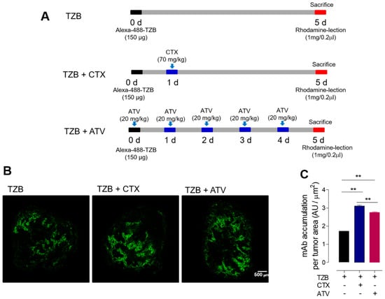 When the tumor size reached 200 ± 20 mm3, Alexa-488-TZB was I.V. injected as a single dose (150 μg) in the control group (n = 7). In the ATV-treated group (n = 7), 20 mg/kg of ATV in a 0.2 mL volume was I.P. injected for 5 days [26]. To compare the therapeutic effect of ATV, CTX (70 mg/kg) was I.P. injected in another group of animals (n = 7) [27]. Five days later, the mice received a lateral tail vein injection of rhodamine-lectin (Rhodamine Ricinus communis Agglutinin I, 1 mg in 0.2 mL of PBS) to delineate blood vessels, and, 5 min after the lectin injection, the mice were euthanized by CO2 inhalation and exsanguinated by cardiac puncture before dissection. The doses and dose schedule are described in detail in Figure 5A.