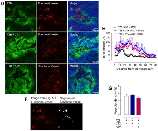 Figure 5B shows the accumulation of Alexa 488-TZB in NCI-N87 tumor tissue. The level of Alexa-488-TZB accumulation was 1.72 ± 0.01 AU/µm2 in the group receiving Alexa-488-TZB alone, 3.10 ± 0.05 AU/µm2 in the group receiving Alexa-488-TZB with CTX co-administration, and 2.76 ± 0.02 AU/µm2 in the group receiving Alexa-488-TZB with ATV co-administration (Figure 5C). The accumulation of Alexa-488-TZB increased by 80% and 60% when co-administered with CTX and ATV, respectively, compared with the accumulation observed for Alexa-488-TZB alone (** p < 0.005). Figure 5D shows the penetration of Alexa-488-TZB from blood vessels. The intensity profile of Alexa-488-TZB with distance from the tumor surface was plotted (Figure 5E). Penetration of Alexa-488-TZB to a distance of 80 µm from the vessel represents an increase of 151% and of 100% during co-administration with CTX or ATV, respectively. In addition, the highest amount of Alexa-488-TZB was shifted toward the tumor core from 15 μm to 27 μm when ATV was co-administered. Figure 5F shows a functional vessel and a segmented functional vessel. Functional vessel density tended to decrease after administration of ATV, but the change was not significantly different. This finding indicates that higher accumulation of Alexa-488-TZB was not due to differences in vascular density among the groups (Figure 5F).