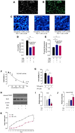 Cytotoxicity of ATV and effect of ATV on apoptosis and tumor growth delay. (A) Ex vivo image of cell nuclei. (B) The edge contours of DAPI-stained cell nuclei were extracted using a Laplacian edge-finding algorithm. (C) Representative images of cell nuclei when CTX or ATV was co-administered with TZB. (D,E) Circularity and fractal dimension of the cell nucleus in tumor tissue (mean ± standard deviation) (** p < 0.005 and * p < 0.05). ATV, atorvastatin. TZB, trastuzumab. CTX, cyclophosphamide. FD, fractal dimension. (F) Cytotoxicity assay according to the concentration of ATV. (G) Cell viability according to the concentration of TZB with ATV (* p < 0.05). (H) Cell lysates were immunoblotted with the indicated antibodies. (I) Relative intensity of Bcl-2. (J) Relative intensity of cleaved PARP. (n = 3, mean ± standard deviation, * p < 0.05). (K) Tumor growth delay for 30 days (n = 3–5 per group). ATV, atorvastatin. TZB, trastuzumab. PARP, poly (ADP-ribose) polymerase 1.