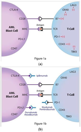 The two best-known inhibitory immune checkpoints are cytotoxic T-lymphocyte antigen-4 (CTLA-4) and the programmed cell death protein 1 receptor(PD-1) (Figure 1a) [1]. On T cells, the CTLA-4 receptor inhibits T cell maturation and differentiation by competing with the costimulatory receptor CD28, for CD80 (B7.1) and CD86 (B7.2) [5]. Although the increased CD80 and CD86 expressions that are associated with poor outcome were reported in AML, treatment with the anti-CTLA-4 monoclonal antibody ipilimumab, proved limited clinical activity [6,7,8]. Encouraging results from trials on solid tumors have turned the attention of researchers to the potential that blocking the PD-1 signaling pathway may have potential applications in the field of hematology–oncology. Those new therapies might target the immune synapse of patients irrespective of the PD-1 expression and thereby could be proposed for a majority of AML patients (Figure 1b).