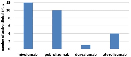 Figure 2 displays the number of active clinical trials for checkpoint inhibitors in AML both in monotherapy and in combination with chemotherapy. The histogram presents trials registered on clinicaltrial.gov [62].