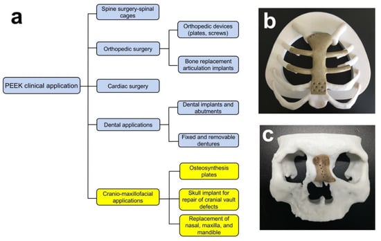(a) Clinical applications of PEEK; Fused deposition modeling (FDM)-printed PEEK (b) breastbone and (c) nasal reconstructions.