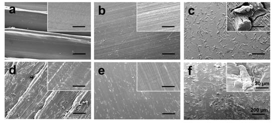 SEM images of PEEK and CFR-PEEK composite: (a) untreated PEEK; (b) polished PEEK; (c) sandblasted PEEK; (d) untreated CFR-PEEK; (e) polished CFR-PEEK; (f) sandblasted CFR-PEEK. Bars represent 200 µm and 20 µm (inserts), respectively.