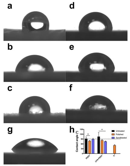 Water contact angle measured on untreated, polished, and sandblasted PEEK and CFR-PEEK samples: (a) untreated PEEK; (b) polished PEEK; (c) sandblasted PEEK; (d) untreated CFR-PEEK; (e) polished CFR-PEEK; (f) sandblasted CFR-PEEK. (g) Ti (additional reference); (h) quantitative contact angle values (means ± standard deviation). The dotted line indicates the contact angle of 90°, which is the division of hydrophilicity and hydrophobicity, * p < 0.05.