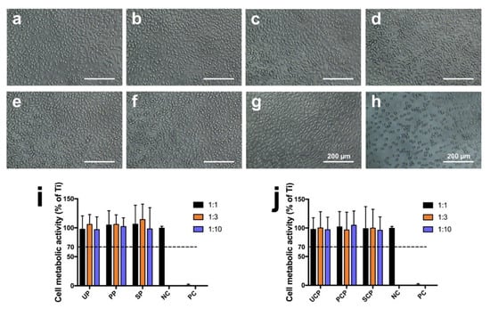 Cytotoxicity tests of L929 cells of PEEK and CFR-PEEK 100% extracts: (a) untreated PEEK; (b) polished PEEK; (c) sandblasted PEEK; (d) untreated CFR-PEEK; (e) polished CFR-PEEK; (f) sandblasted CFR-PEEK; (g) negative control (Ti); (h) positive control (Cu). (i,j) shows the quantitative result of the CCK-8 test in the culture media with different extract concentrations of PEEK and CFR-PEEK. The data are presented as means ± standard deviation. UP: untreated PEEK; PP: polished PEEK; SP: sandblasted PEEK; NC: negative control; PC: positive control; UCP: untreated CFR-PEEK; PCP: polished CFR-PEEK; SCP: sandblasted CFR-PEEK. The dotted line indicates the toxicity threshold of 70% cell viability according to ISO 10993-5.