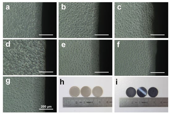 Microscopic images of L929 cells observed around samples of direct contact test after culturing for 24 h. (a) untreated PEEK; (b) polished PEEK; (c) sandblasted PEEK; (d) untreated CFR-PEEK; (e) polished CFR-PEEK; (f) sandblasted CFR-PEEK; (g) Ti; (h) PEEK samples (untreated, polished, and sandblasted); (i) CFR-PEEK samples (untreated, polished, and sandblasted).