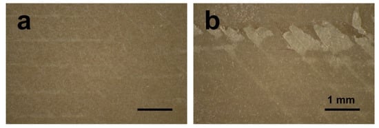 Polishing and sandblasting are common surface processing methods in dentistry to get a smooth or rough surface. However, the FDM-printed sample surfaces were much rougher compared with sandblasted ones, as shown in Figure 3 and Figure 4. This finding can be related to the working principle of FDM. Thermoplastic materials are extruded by the printing nozzle, which can move across the building platform in x- and y-axes, to generate a 2D layer line by line. Then, a 3D object is built up by melting the successive 2D layers together. The crosswise oriented, threadlike inner structure of the specimen results in some unfilled areas between lines and layers, and also in the original printing structures on sample surfaces [36]. In this study, the sandblasted samples showed slightly rougher surfaces than the polished ones. Compared with some previous studies, the sandblasting parameters (i.e., distance and pressure) in this research had to be set lower in order not to perforate the layer-by-layer manufacturing pattern [26,27,37]. In other studies, using traditional methods to fabricate PEEK and its composite samples like injection molding or milling, the interior of the blocks was homogenous without layers or unfilled areas. The samples in this study were produced using FDM technology, laying down objects in layers with a thickness of 0.2 mm. If a higher sandblasting pressure or closer distance were applied to modify the sample, the upper surface layer would be exfoliated (Figure 9). Therefore, based on the parameters used for sandblasting in this study, the sandblasted sample surfaces were slightly rougher than the polished ones, but not obviously different.