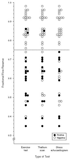 Non-invasive assessment of ischemia compared with FFR. Reprinted with permission from Pijls et al. [22]. In 45 patients with chest pain and moderate (~50%) coronary artery stenosis, exercise stress testing, thallium scintigraphy, and stress echocardiography with dobutamine were performed. These results were compared with FFR measurements. The dashed line indicates the pre-specified FFR threshold for ischemia of 0.75 and each circle represents patients who were found to have ischemia or no ischemia by stress testing. Nearly every patient with ischemia by stress testing was found to have a coronary stenosis with an ischemic FFR value. After revascularization non-invasive tests were repeated and there was no longer evidence of ischemia.