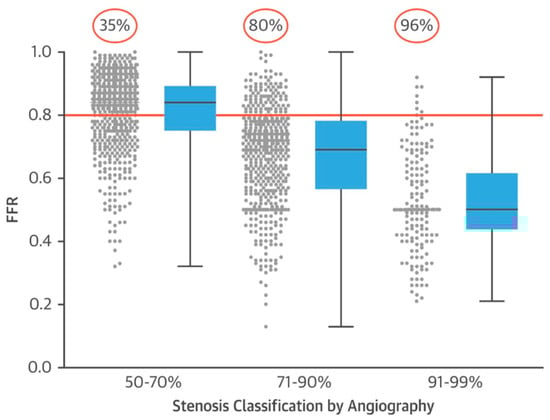 Fractional flow reserve (FFR) values and angiographic severity of lesions in the FAME trial. Reprinted with permission from Jeremias et al., 2017 [14] (which was adapted from Tonino et al 2010) [26]. Angiographic findings of the FFR-guided revascularization arm in the FAME trial [25]. Scatterplot of FFR values shows significant heterogeneity in the physiological significance of angiographic stenoses. Stenoses of 50–70% angiographic severity were found to have an ischemic FFR (0.8, red bar) in 35% of cases. In angiographic stenoses of 71–90%, FFR was in the ischemic zone in 80% of cases. In 91–99% angiographic stenoses FFR was ischemic in 96% of cases.