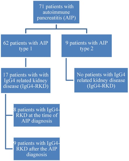 - Tsubata, Y.; Akiyama, F.; Oya, T.; Ajiro, J.; Saeki, T.; Nishi, S.; Narita, I. IgG4-related chronic tubulointerstitial nephritis without autoimmune pancreatitis and the time course of renal function. Intern. Med. 2010, 49, 1593–1598. [Google Scholar] [CrossRef] [PubMed]