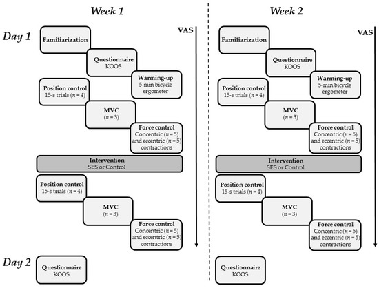 Schematic overview of the experimental protocol. The “n” within the boxes refer to the number of trials for that particular measure. KOOS: knee injury and osteoarthritis outcome score; MVC: maximum voluntary contraction; SES: somatosensory electrical stimulation. VAS: visual analogue scale.