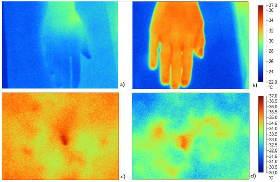 By way of an example, Figure 1 shows the temperature image in the baseline condition for the hand (Figure 1a,b) and the abdomen (Figure 1c,d) of a lean subject (Figure 1a,c) and an overweight subject (Figure 1b,d). Color scale at the right side of the picture indicates the temperature values (°C).