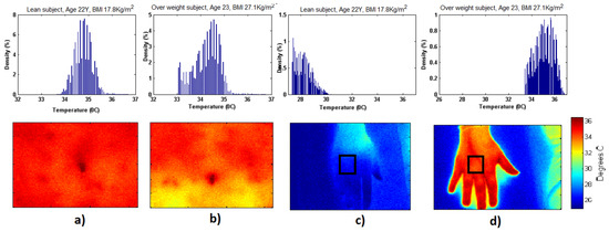 The density graph of two subjects belonging to the same age group (22 ± 1 year) but with different BMIs (22 years with 17.8 kg/m2 and 23 years with 27.1 kg/m2) are shown in Figure 2. We observed a normal Gaussian-like thermal distribution on the abdominal area in lean subjects compared to the overweight subjects, where we observed irregular thermal distribution and relatively lower temperature distribution. On the contrary, we observed non-Gaussian thermal distribution on the hands of both lean and overweight subjects. However, we observed lower temperature density in the case of the lean subjects and relatively higher temperature density in the overweight subjects, indicating that overweight subjects had increased heat dissipation through the hands. Based on our findings, we believe that the temperature distribution of these data predicts the spectral distribution of two groups. However, with this limited data it is difficult to draw a conclusion with full confidence regarding Gaussian/non-Gaussian behavior of two groups.