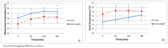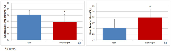 Mean abdominal temperature was significantly greater in lean than overweight participants (34.11 ± 0.70 °C compared with 32.92 ± 1.24 °C, p < 0.05, Figure 3a). Mean hand temperature was significantly greater in overweight than lean subjects (31.87 ± 3.06 °C compared with 28.22 ± 3.11 °C, p < 0.05, Figure 3b).
