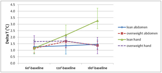 Regarding the comparison of thermal response in lean and overweight subjects, we observed that overweight participants, as compared to the lean subjects, had lower abdominal skin temperature than in the hand indicating relatively higher temperature in overweight subjects. This obtained lower abdominal skin temperature is in agreement with the literature, and indicates that a high body fat percentage is associated with low skin surface temperature [4,24,25]. The phenomenon was originally observed in 1937 [26] using a method of partitional calorimetry.