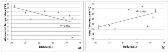 In a regression model relating baseline temperatures measured by IRT to body fat (%), the abdominal temperature was negatively related to body fat (R2 = 0.445, p < 0.05) (Figure 7a), while hand temperature was positively related to body fat (R2 = 0.452, p < 0.05) (Figure 7b).