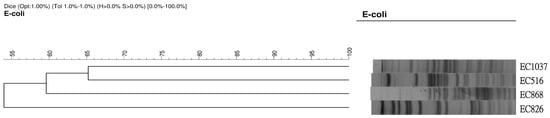 Pulsed-field gel electrophoresis (PFGE) patterns of four mcr-1-positive carbapenem-resistant Escherichia coli (E. coli).