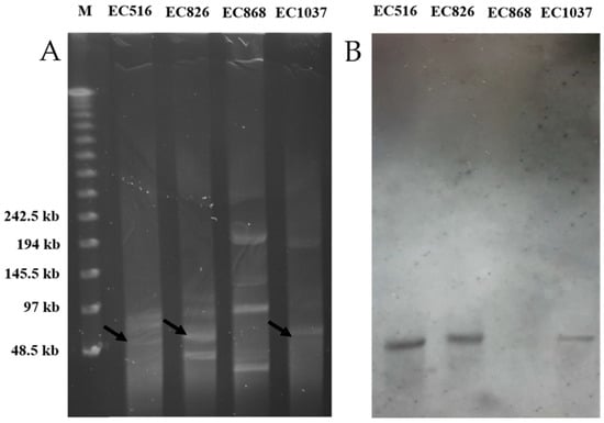 (A) S1 nuclease PFGE patterns of plasmids from four clinical isolates. (B) the Southern blotting pattern (“M” indicates the lambda molecular weight marker, arrows indicate hybridized plasmids which were shown with positive signals by Southern blot hybridization with the probe).