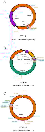 All of the sequencing analyses of carbapenem-resistance plasmids are shown in Figure 3. For E. coli EC516, its blamcr-1-encoding plasmid was p5CRE51-MCR-1, with a size of approximately 60.9 kb. For E. coli EC826, its blamcr-1-encoding plasmid was pHNGDF93, with a size of approximately 62.3 kb containing one insertion within mcr-1. For E. coli EC1037, its main blamcr-1-encoding plasmid was pHNGDF93 with a size of approximately 63.6. Only one CRCE 868 isolate with mcr-1 inserted in the chromosome, not within the plasmid, was found.
