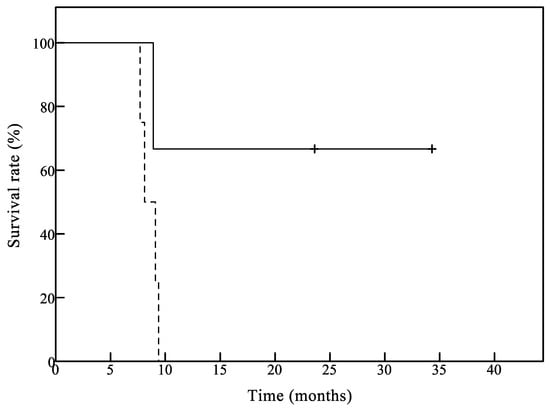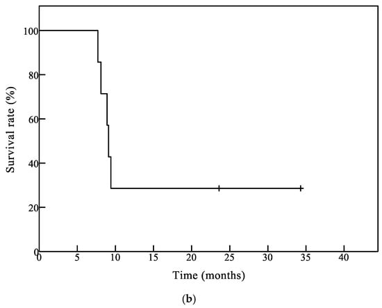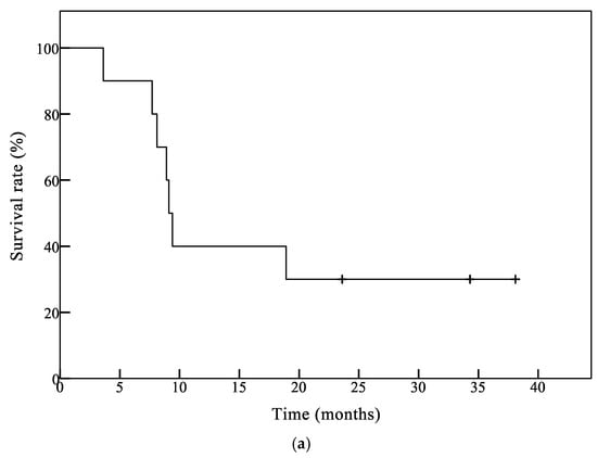 The Kaplan–Meier curves for overall survival in all 10 patients and seven glioblastoma (GB) patients are shown in Figure 1a,b, respectively. The median overall survival time (mOS) in all patients and GB patients was 9.2 months and 9.1 months, respectively. One-year OS was 44.4% for all patients and 33.3% for GB patients, respectively.