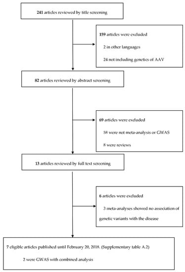 The eligible studies were selected according to the standardized reporting protocol of systematic reviews and meta-analyses PRISMA (Preferred Reporting Items for Systematic reviews and Meta-Analyses) checklist (Table S1) [7]. A systematic search was performed in PubMed and EMBASE to retrieve studies published before 20 February 2018. Antineutrophil cytoplasmic antibody (ANCA)-associated vasculitis, polymorphisms, meta, genetic, variant and genome-wide association study (GWAS) were the terms used in the systematic search. At the end of the systematic search, 241 articles were identified, 13 were screened in detail, and 7 were selected for analysis [4,5,6,8,9,10,11]. (Figure 1 and Table S2).