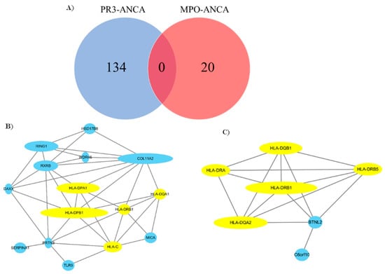 The number of noteworthy SNPs in PR3-ANCA and MPO-ANCA and their protein–protein networks (PPIs). (A) The overlap of SNPs in PR3-ANCA and MPO-ANCA; the lack of any shared SNPs between these two subtypes of ANCA-associated vasculitis. (B) PPI network of genes associated with PR3-ANCA vasculitis. (C) PPI network of genes associated with MPO-ANCA vasculitis. Borderline SNPs (5.0 × 10−8 < p < 0.05) from GWASs that have been noteworthy in our analysis were also included. The yellow nodes represent the genes associated with the interferon-gamma-mediated signaling pathway. The number of SNPs associated with PR3-ANCA and MPO-ANCA is 134 and 20, respectively, which leads to a total of 21 and 8 unique genes. Note that some genes have multiple SNPs associated with PR3-ANCA and MPO-ANCA. Among these genes, only 15 genes and 7 genes are included in the PPI network by revealing known PPI interactions in Figure 2B,C.