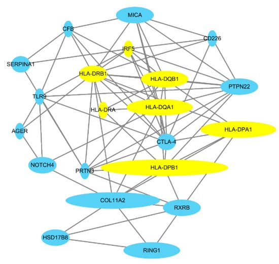 Protein–protein interaction network of associated genes in the etiopathogenesis of ANCA-associated vasculitis. The size of the node indicates the number of noteworthy SNPs of each gene. This network includes noteworthy SNPs and GWAS SNPs. The variants are listed in Table S7. The yellow nodes represent the genes associated with the interferon-gamma-mediated signaling pathway.